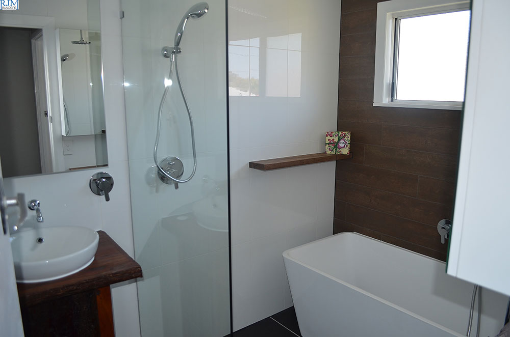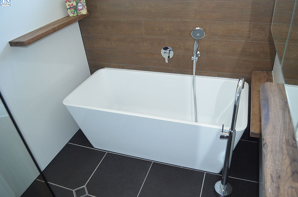 The Bathroom Builder mounted the shelves into the frame work of the stud wall, and then sheeted and tiled around the shelves, creating a clean, and bracket-less finish.