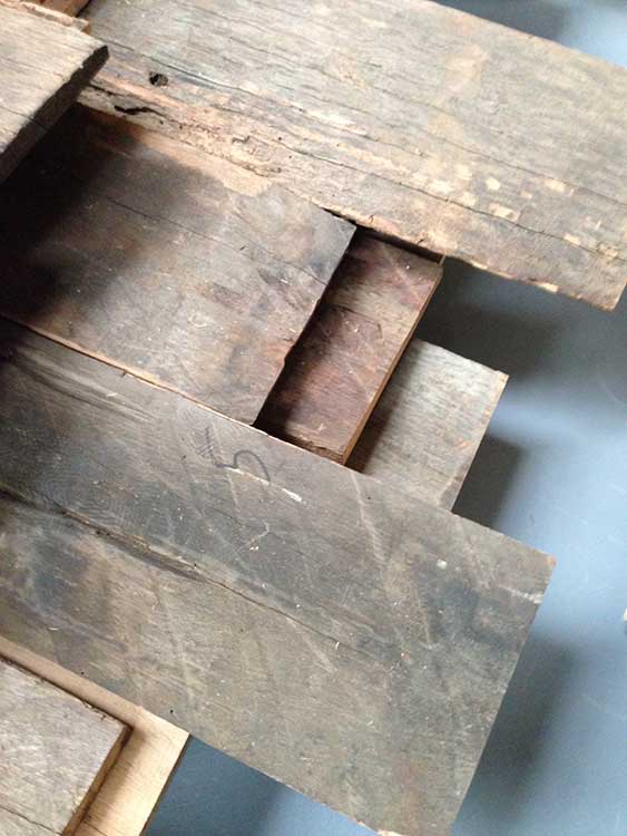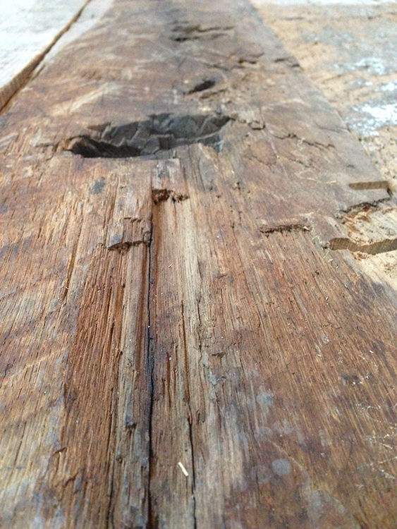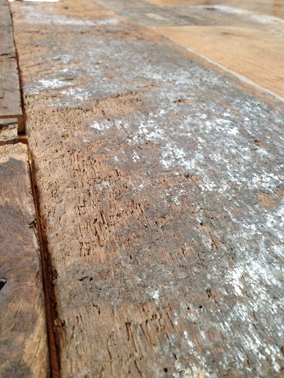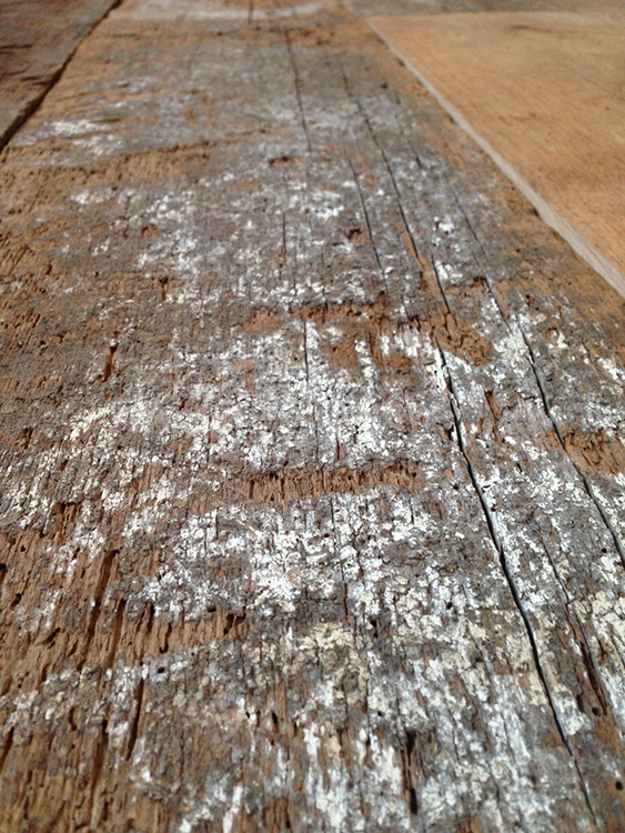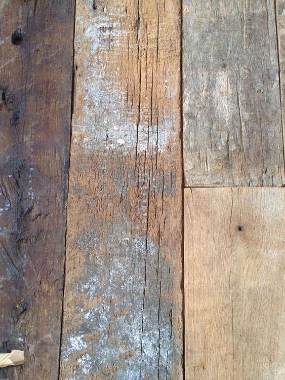 1. The exposed face of post & beam material, which has been cut from the beam to create our re-milled, Recycled French Oak flooring.